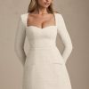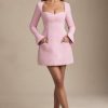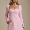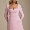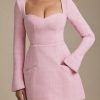 Perfect structure. An instant favourite, the Tacita mini dress is crafted from premium textured tweed to a structured silhouette with a waist-defining bodice and exaggerated tulip skirt that holds its shape. It’s framed with a delicate sweetheart neckline, long flared sleeves with split cuffs, and two slip pockets that cement the classic tailored aesthetic.
