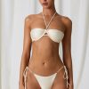 Ethereal swim silhouettes. Inspired by candy-coloured sunrises in the tropics, the Tahiti bikini top is available in three lustrous pastel hues. It’s crafted from premium stretch-tricot swim fabric with a glossy satin finish and cut to a halterneck silhouette with crossover straps tipped with faux-pearl detailing. The ruched, underwired cups provide enhanced lift and support.