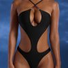 Bead-Embellished Cut-Out Halterneck Swimsuit in Black