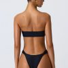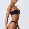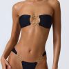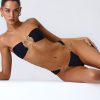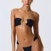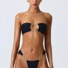 Beach club styling made easy. Perfect for minimising tan lines on sun-soaked days, this bikini top is crafted from stretch-jersey swim fabric to a bandeau silhouette with internal silicone taping for enhanced hold and support. It’s uplifted with a statement cut-out at the bust, anchored with hammered gold-tone ring detailing.
