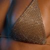Dive into a long, hot vacation. Designed in stretch swim fabric with a fully embellished rhinestone overlay, the Embellished Swim triangle bikini top is a glittering swim silhouette destined to catch eyes. Complete with functional tie fastenings at the neck and back and a functional ruched channel at the bust.